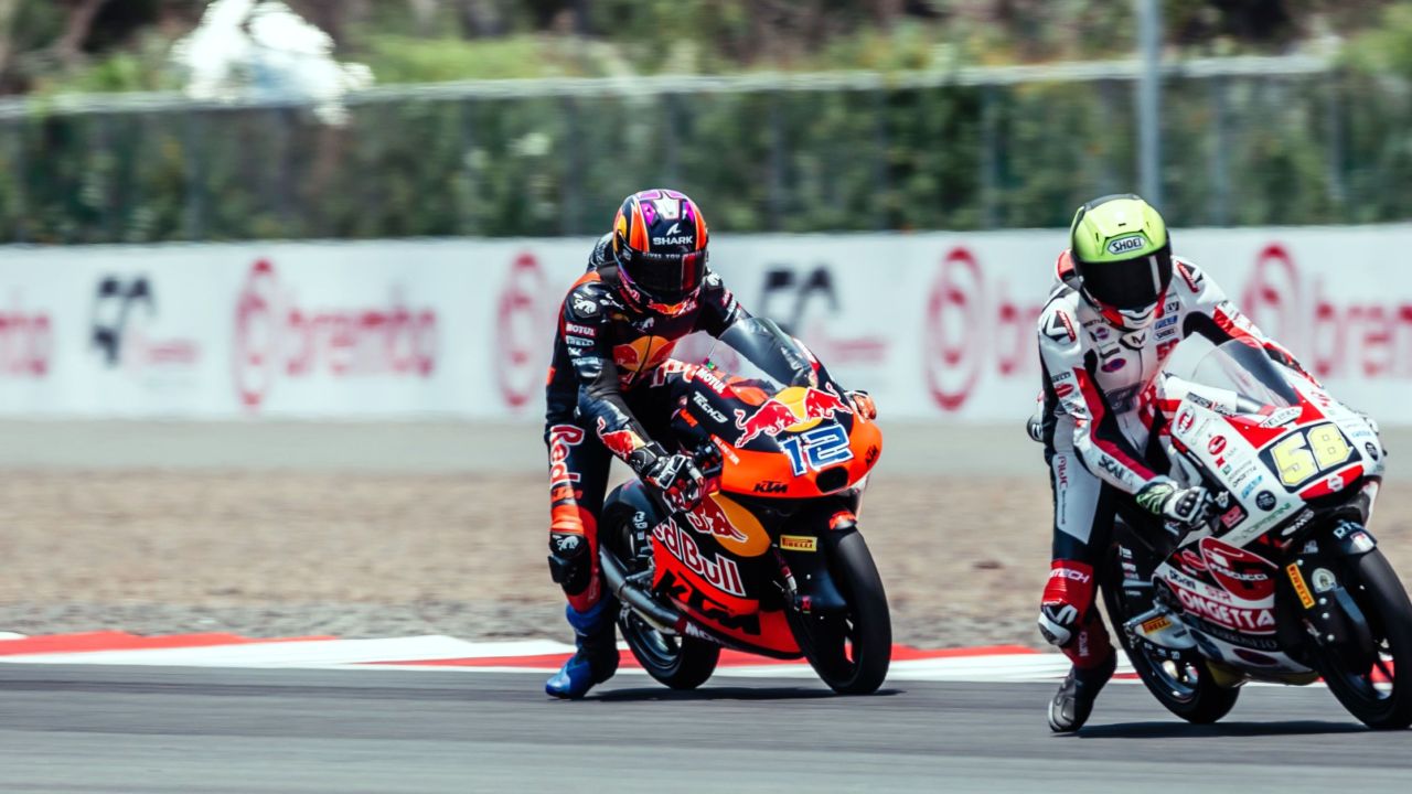 As he lined up in P13 on the grid under a scorching sun on the island, Jacob Roulstone took a solid start as lights were out at 12:00 (UTC+8). He earned one spot to sit behind Guido Pini as Joel Keslo took the lead, ahead of David Munoz and Maximo Quiles. Jacob progressed to 9th in the third sector with incisive overtakes to exit lap 1 in the back wheel of Taiyo Furusato. One more position was gained in lap 2 to 8th for Jacob, to lead his group, 0.3 seconds from Munoz ahead, as the Spaniard had dropped from the front 3. A solid early pace allowed Jacob to close soon enough the gap to his rivals, while Kelso crashed in lap 4 while at the front. That meant P7 for Roulstone entering lap 5, but Jose Antonio Rueda and Angel Piqueras were boiling hot behind, waiting for the opportunity to make their moves. These two eventually went through on lap 6, and Jacob was back in 9th. However, he held the pace to keep contact with Piqueras, and that gave him the confidence to lap a solid 1’37.329 on lap 7, which ended up being the second fastest race lap. A small mistake from the #12 then saw Luca Lunetta go through both Roulstone and Piqueras, and that was P10 for Jacob after 10 laps, but the battle for 9th was intense against the Spaniard. We were halfway through the race then, and pole sitter Adrian Fernandez led charges, just ahead of Rueda, provisionally world champion at the time, with Piqueras in 9th. The battle for 9th kept going for a few laps, until a multi-rider crash in the last sector of lap 14 redistributed the cards, and Jacob was now up to 8th, 6 laps to the end. The battles at the front were spicy, which allowed Jacob to catch back a bit as he fought against his used tires. Quiles and Piqueras were handed long lap penalties for short cuts, and Piqueras completing his own allowed Jacob to earn one more spot. Finally, David Munoz’ big crash ahead had Jacob in 6th with two laps to go, but the red flag was instantly waved, calling it an early end for the Moto3™ race! Additional penalties post-race gave Jacob the 5th place, his best result in the class, so congratulations to him!